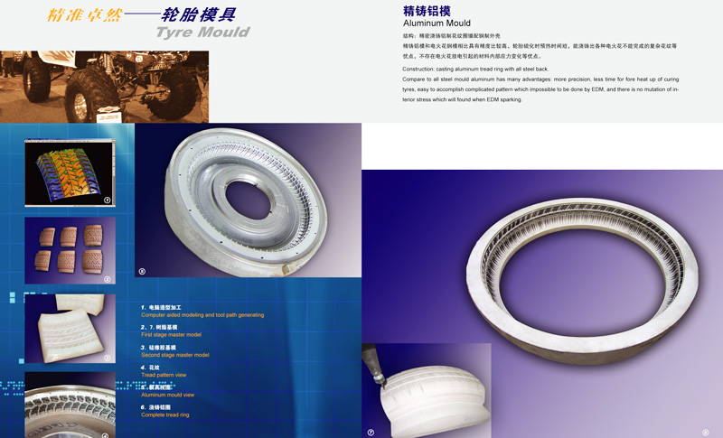 精鑄鋁模和電火花鋼模相比具有精度比較高、輪胎硫化時(shí)預(yù)熱時(shí)間短,能澆鑄出各種電火花不能完成的復(fù)雜花紋等優(yōu)點(diǎn),不存在電火花放電引起的材料內(nèi)部應(yīng)力變化等優(yōu)點(diǎn)。